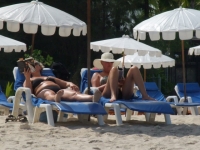White Sand Beach (ไวท์แซนด์บีช) (KhaoLak) Arguably White Sand Beach is the most beautiful beach of Khao Lak with fine white sand and crystal clear water, now decorated with many rows of deck chairs and umbrellas on private land beside the beach.For many years thousands of tourists considered Ao Thong Beach or Oaw Thong Beach in the misspelled version the most beautiful beach in the Khao Lak region. A few years ago the owner of the lone restaurant beside Sarojin Resort distributed his property among his three children. Each of them started a new restaurant. One was called White Sand, and soon the whole beach became known as White Sand Beach. As now three families had to live from the income generated by three competing restaurants, the three owners had to up with some new ideas. So they built a few bungalows behind the restaurants, all in the same typical Thai style with air conditioning but windows without mosquito screens, and all for the same price of about 1500 Baht. Income was not enough, so a new idea was born: Rental of deck chairs and umbrellas along the beach on their own properties. So up to 5 rows of deck chairs now create the real holiday feeling for those tourists who need them for a perfect holiday. Latitude: 8.73925, Longitude: 98.24315, Distance from Khao Lak Town: 12,5 km to the north |